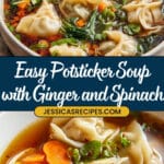 Warm and comforting potsticker soup featuring tender pork or chicken dumplings simmered in a flavorful ginger-garlic chicken broth, enhanced with fresh spinach or bok choy and garnished with green onions and sesame oil.