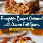 - Cool and Serve: Allow the baked oatmeal to sit for about 5 minutes before cutting into squares. Serve warm, optionally topping with yogurt, whipped cream, an extra drizzle of maple syrup, or a sprinkle of pumpkin pie spice for extra flavor.