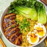 This Easy Chicken Ramen recipe features tender marinated chicken breasts cooked in a savory soy and mirin glaze served over flavorful ramen noodles in a rich chicken broth. Topped with silky egg yolk and mayonnaise mixture, boiled eggs, bok choy, and scallions, this comforting bowl of ramen combines simple ingredients with bold flavors for a quick and satisfying meal.