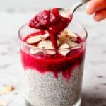- Assemble and serve: Divide the chia pudding evenly into two small glasses or jars. Pour the cooled raspberry sauce generously over the pudding. Finish by sprinkling almond flakes on top for added crunch and flavor. Serve chilled.