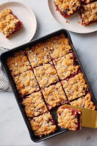 These bars pair wonderfully with a hot cup of coffee or a scoop of vanilla ice cream. When I serve them at brunch, I like fresh fruit on the side to complement the raspberry notes—berries or orange segments work especially well.