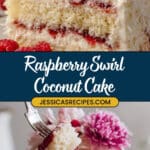 A delightful Raspberry Swirl Coconut Snowball Cake featuring moist coconut-flavored layers filled and frosted with a creamy coconut cream cheese frosting swirled with sweet raspberry preserves and finished with a generous coating of shredded coconut. Perfect for celebrations or a tropical-inspired treat.