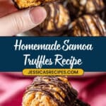 Delicious Samoa Truffles inspired by the classic Girl Scout Samoa cookies, featuring a rich combination of shredded coconut, dulce de leche, sweetened condensed milk, and crushed Nilla Wafer cookies, all dipped and drizzled in luscious dark chocolate.