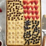 - Slice and serve: Carefully remove the pan from the oven and let it cool slightly. Slice the baked pancake sheet into 24 squares, with 6 squares per topping section. Serve warm with maple syrup for drizzling.