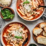 This comforting Chicken Parmesan Soup combines the rich flavors of garlic, bell pepper, crushed tomatoes, and Italian seasonings with tender shredded chicken and pasta. Slow-cooked to perfection and finished with Parmesan and mozzarella cheeses, it’s a hearty, cozy dish perfect for any occasion.
