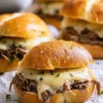 Tender and flavorful Crockpot French Dip Sandwiches made with slow-cooked beef chuck roast, seasoned with garlic and onion powder, and served on toasted hoagie rolls with melted provolone cheese and a rich au jus for dipping.