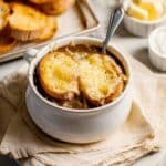 This Slow Cooker French Onion Soup is a comforting classic with deeply caramelized onions simmered in rich beef broth, enhanced with herbs and a touch of balsamic vinegar. The soup is served with homemade garlic croutons topped with melted Swiss and Parmesan cheeses, creating a warm, hearty meal perfect for cozy nights.