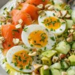A refreshing and nutritious cottage cheese salad featuring smoked salmon, creamy avocado, crunchy cucumber, and a perfectly cooked egg. This salad is topped with chopped chives and almonds for added flavor and texture, dressed simply with olive oil, salt, and pepper. Ideal for a light lunch or a healthy snack.