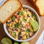 - Combine ingredients: In a large bowl, mix together the chicken, corn, black beans, red bell pepper, red onion or green onions, fresh cilantro, cumin, smoked paprika, salt, pepper, and lime juice. Add the mayo or Greek yogurt and hot sauce, stirring well until everything is evenly coated.