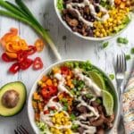 A flavorful and colorful Southwest Steak Salad featuring marinated sirloin steak with a tangy chili lime marinade, paired with a vibrant mix of romaine lettuce, sweet corn, black beans, peppers, and avocado. Topped with a creamy, zesty Southwest yogurt ranch dressing, this gluten-free salad is perfect for a satisfying and healthy meal.