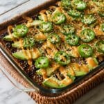 - Garnish and Serve: Remove from oven and garnish with sesame seeds, sliced avocado, chopped scallions, jalapeños, and any extra sauce desired. Serve warm. For best flavor, you can prepare layers ahead and bake just before serving.