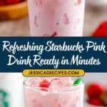 A refreshing and vibrant Starbucks Pink Drink copycat made with cold Ocean Spray White Cran Strawberry juice and creamy Silk Coconut Milk, topped with freeze-dried strawberries for a fruity and tropical taste perfect for a quick, delicious treat.