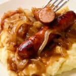 Classic British comfort food featuring juicy bratwurst sausages served over creamy mashed potatoes and smothered with rich stout onion gravy made with Guinness beer.