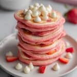 Delight in these fluffy Strawberries and Cream Protein Pancakes, perfectly balanced with oat flour, a whey-casein protein blend, and creamy Greek yogurt. Lightly pink and studded with white chocolate chips, these pancakes offer a healthy, protein-packed breakfast or snack option topped with fresh strawberries and optional fat-free whipped cream and light syrup.