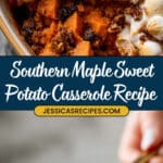 A comforting Southern Maple Sweet Potato Casserole featuring roasted sweet potatoes blended with warm spices, maple syrup, and raisins, topped with a sweet maple-pecan glaze and melted marshmallows, perfect for holiday gatherings or cozy family dinners.