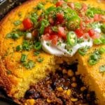 - Layer Beef Mixture: Spoon the beef and bean filling evenly over the cornmeal bottom layer.