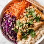 - Assemble the Bowls: Start by layering cooked Jasmine rice in your serving bowls. Top with sliced baked chicken breasts, shredded cabbage, shredded carrots, chopped cilantro, and chopped peanuts if using. Drizzle generously with the prepared peanut sauce and serve immediately.