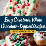 Delightfully festive and easy-to-make Christmas White Chocolate-Dipped Sugar Wafers coated in creamy white candy melts and decorated with colorful holiday sprinkles. Perfect as a sweet holiday treat or gift.